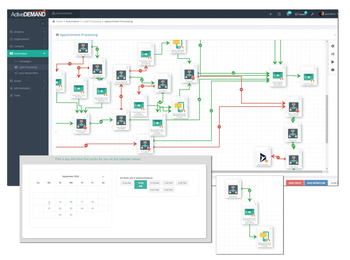ActiveDEMAND is a full-featured appointment scheduling system. ActiveDEMAND’s built-in appointment scheduler offers key features not found in other solutions such as the ability to capture session data and remove anonymity from visitors, white-labeling to drive your branding, custom appointment landing pages, customized reminder workflows, full tracking of email opens/link clicks and more.