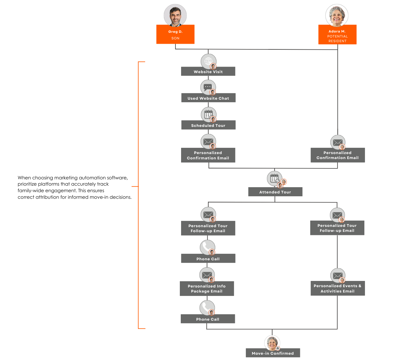 Effectively managing those dynamics means your marketing automation platform requires a contact relationship model that tracks the relationships between family members and stakeholders and accurately attributes the right touchpoints and engagement data to individuals. Knowing who is involved in the ‘collective’ buyer’s journey from initial outreach to their role in the final move-in decision has a big impact on: