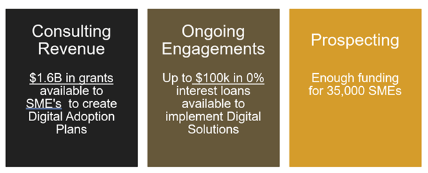 This grant is for SMEs, like marketing agencies or their clients, who may already be embarked on their digital journey and looking to expand their digital technology. The program includes digital transformation across multiple areas, such as accounting, IT infrastructure, cyber security, and customer support services, but most relevant to marketing agencies is online sales and marketing infrastructure.