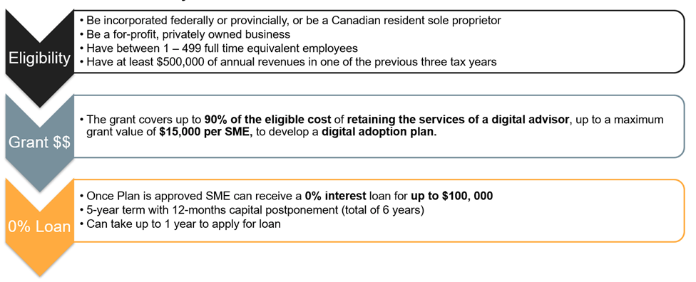 The Canada Digital Adoption Program (CDAP) is providing 4 billion dollars in total funding to help small to medium-sized businesses (SMEs) embrace digital transformation. This Government of Canada program helps SMEs adopt digital technologies to increase their competitiveness. Eligible businesses will receive a grant to build their digital plan, followed by a 0% loan of up to $100,000 to implement it.